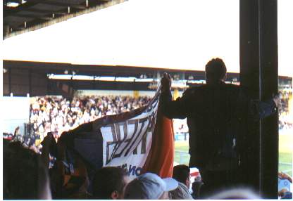 Da mein Mitfahrer sein Ticket irgendwo verlegt hatte..., begab man sich schon am Vormittag zu einem zweistündigen Spaziergang, um ein neues Ticket zu kaufen, das meine in einen Stehplatz zu tauschen und im Fanshop nach Devotionalien zu suchen. Das Spiel sollte um 17.15 Uhr beginnen und so nutzte man die viele Zeit zwischendurch zur Aufnahme von Nahrung und Ähnlichem. Ich trank das teuerste Bex meines Lebens (umgerechnet 5,10 € für 0,33l), weitere zu diesem Preis wurden mir verboten und so probierte ich mich durch die verschiedensten nichtenglischen Sorten, da einheimische zumeist Mangelware waren. Zeitig zum Spiel nahmen wir unsere Stehplätze ein, ich konnte sehen und hatte einen Wellenbrecher, also fast wie in Bischofshol, allerdings etwa auf Höhe des Elfmeterpunktes auf der Tribünenseite. Der Auswärtsblock befand sich gleich rechts schräg gegenüber, hinter dem Tor. Diese Tatsache bescherte uns dann auch unterhaltsame