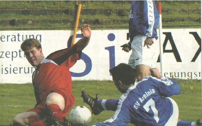 Bei sehr eigenartigem Wetter wurde gespielt. Regen und Orkanböen wechselten sich über die gesamte Spielzeit ab und den Biertrinkern wurde der Schaum aus den Bechern geweht. Arminia begann ebenso stürmisch und hatte gegen in der Abwehr unsichere Gäste aus Ihrhove auch drei große Möglichkeiten in der ersten Hälfte. Das Leder verfehlte jedoch das Gehäuse oder konnte vom guten Keeper der Concorden abgewehrt werden. Bei den herrschenden Wetterverhältnissen war es natürlich kaum möglich lange Bälle zu spielen, denn sobald diese vom Wind erfasst wurden landeten sie im Aus. So musste mit kurzen Flachpässen operiert werden, was Arminia auch ganz gut gelang. Die Ihrhover wurden in der zweiten Halbzeit stärker, aber zunächst hatten weiter nur die Giganten im blauen Dress Chancen. In der 51. Minute fiel dann der verdiente Führungstreffer durch einen Freistoß, den Markus Erdmann überlegt aus zirka 20 Metern überlegt einschob. Im weiteren Verlauf des Spieles gab es noch Chancen das Ergebnis in die Höhe zu schrauben, doch auch hier konnte sich der Ostfriesenschlussmann auszeichnen. Das durfte dann auch Alexander Repschläger im Kasten der Götter, denn die letzten zehn Minuten der Partie waren nichts für Kardiologiepatienten. Zweimal klärte Repschläger Schüsse aus Nahdistanz, einmal strich der Ball nur Millimeter am Tor vorbei. Kurz vor dem Ende tauchte Erdmann allein vor dem Gästetor auf und versuchte das Spielgerät am herausgeeilten Torwart vorbeizuschieben, doch mit einer Blitzreaktion hielt der gute Mann und krönte seine Leistung mit der Roten Karte, denn er befand sich bereits außerhalb des Strafraums. Der anschließende Freistoß brachte nichts und dann war auch Schluss und zum Heulen des Orkans gesellte sich ein Jubelsturm. Dirk